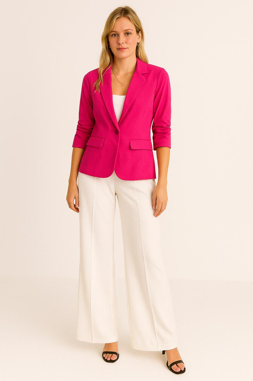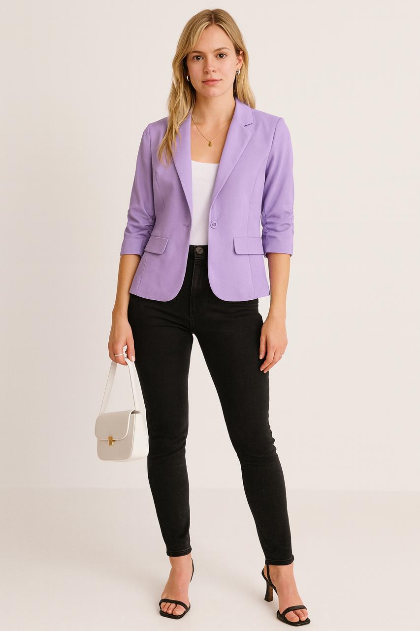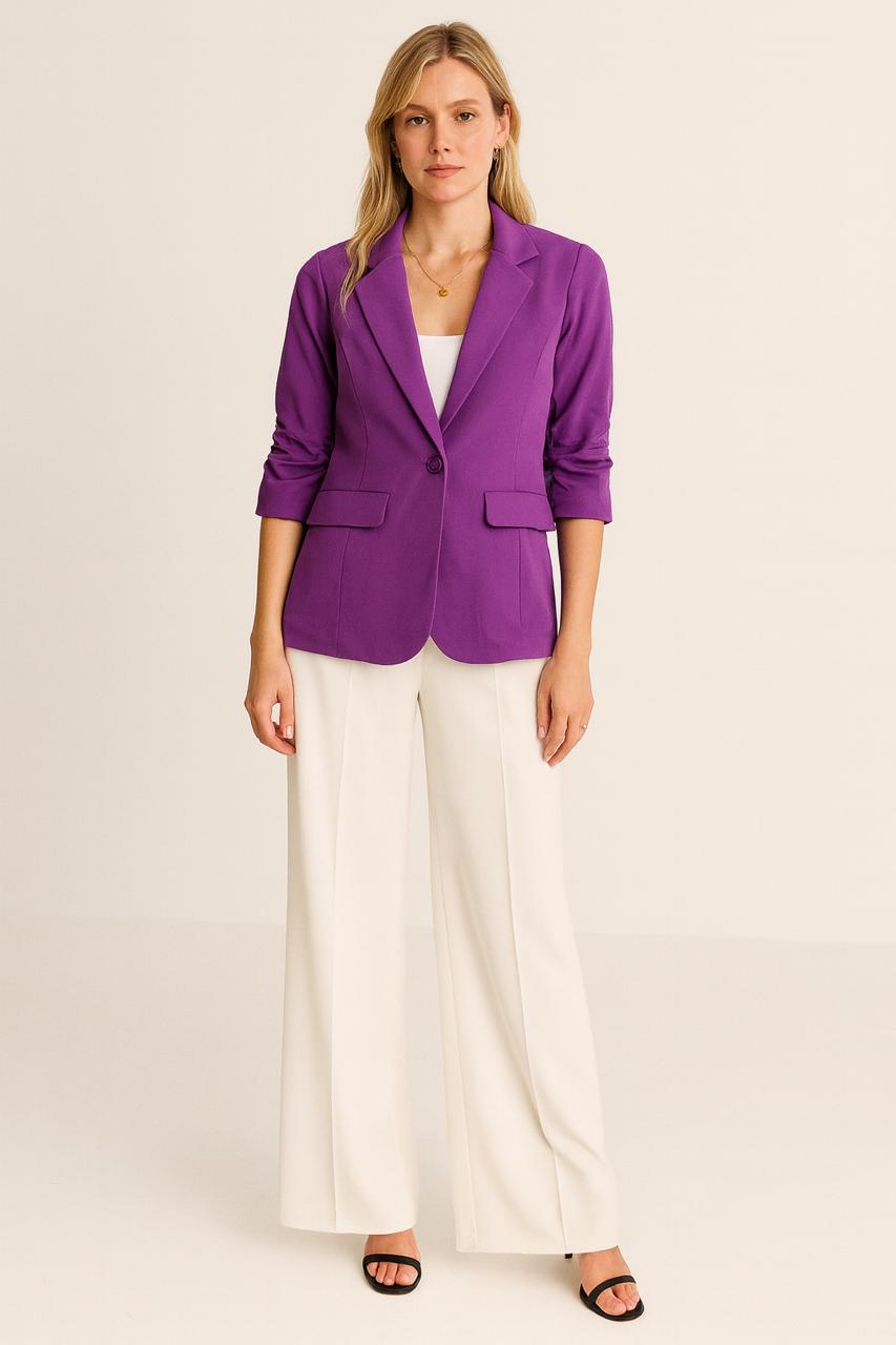 BLAZER SASTRERO, DISTINTIVO POR SU MANGA FRUNCIDA, ES UN MODELO QUE SE PUEDE USAR ABIERTO O ABOTONADO, CUENTA CON LOS BOLSILLOS ADELANTE, ESTE MODELO VA ENTALLADO AL CUERPO