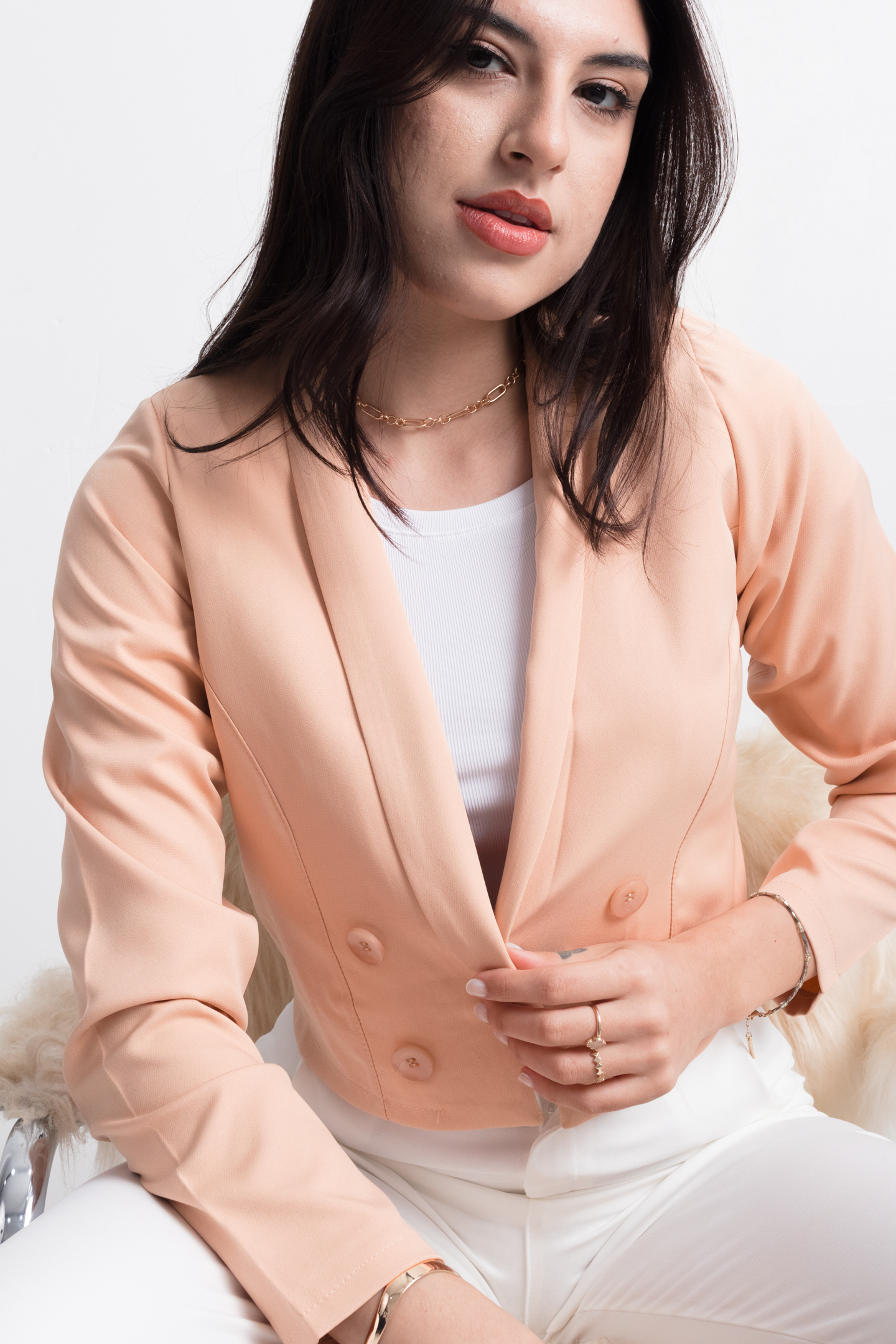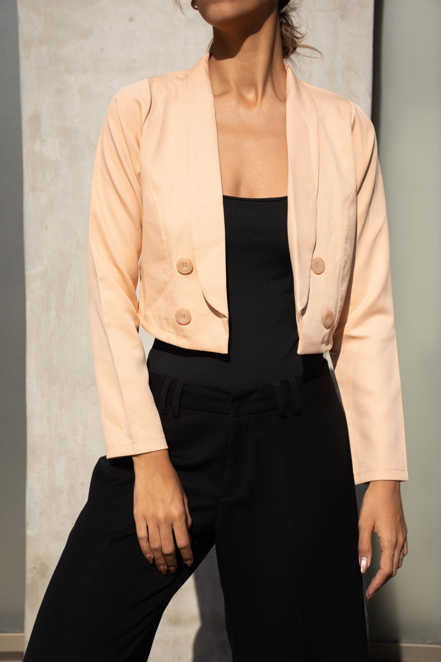 BLAZER SASTRERO CORTO, ES UN MODELO SIMPLE PERO DELICADO, TIENE LOS BOTONES DE ADORNO Y CON LAS MANGAS LARGAS, ESTE MODELO LLEGA HASTA LA CINTURA.