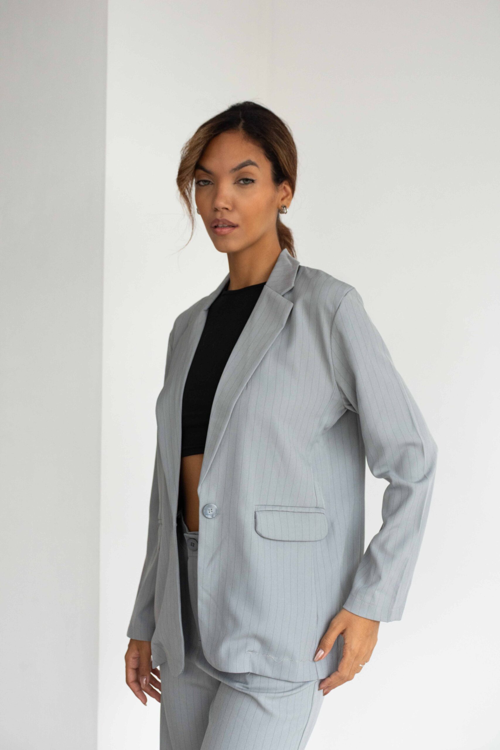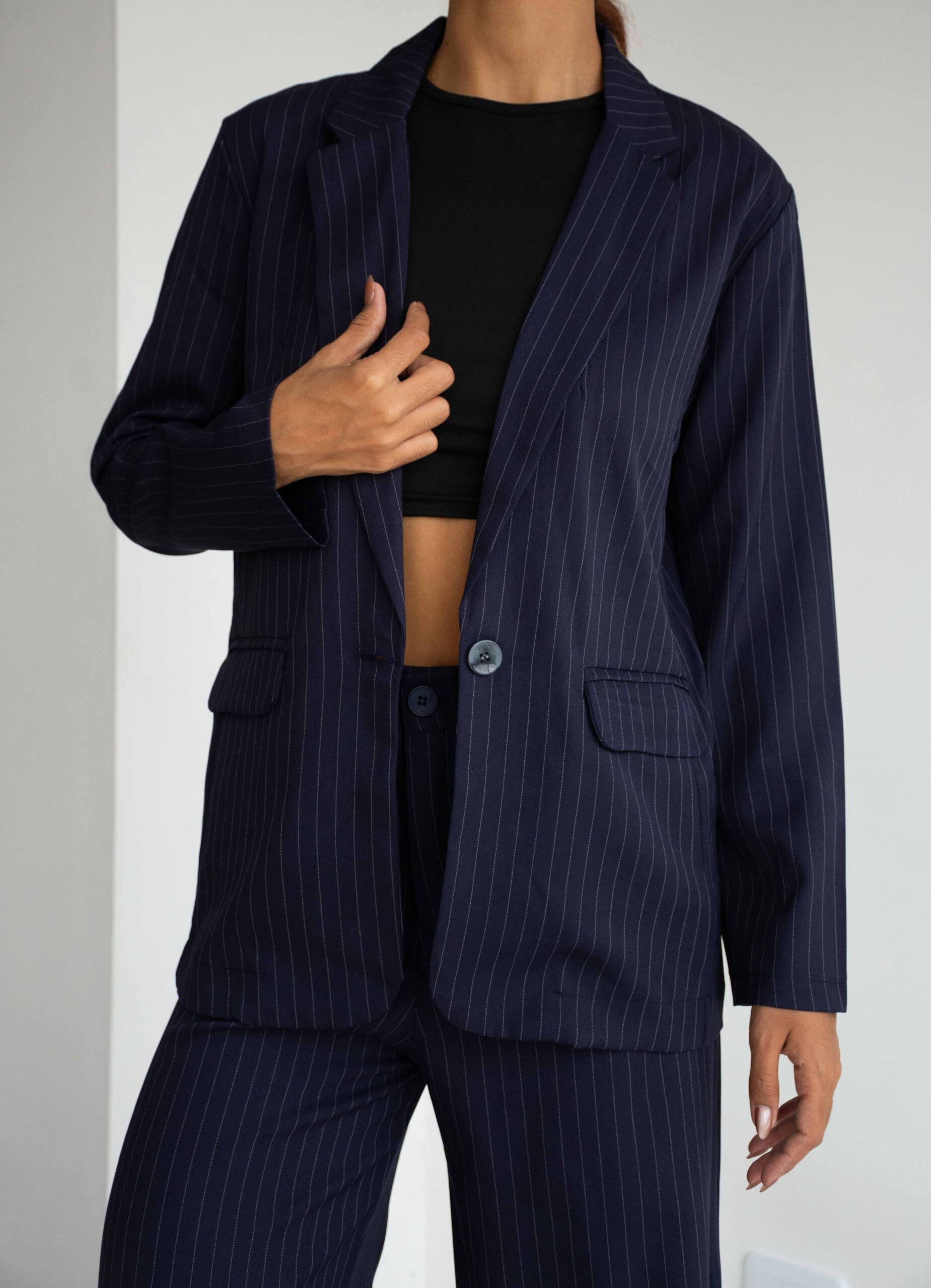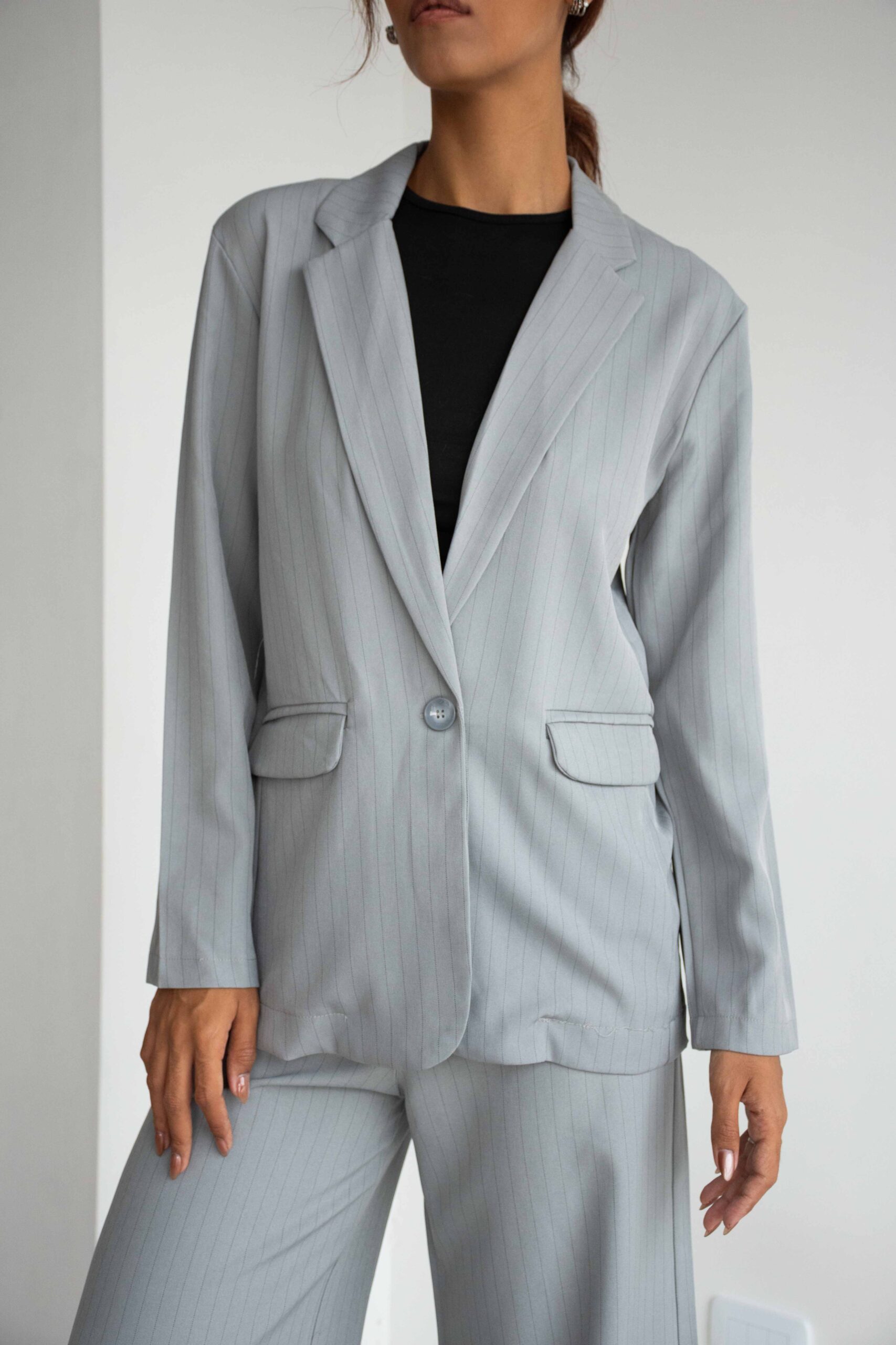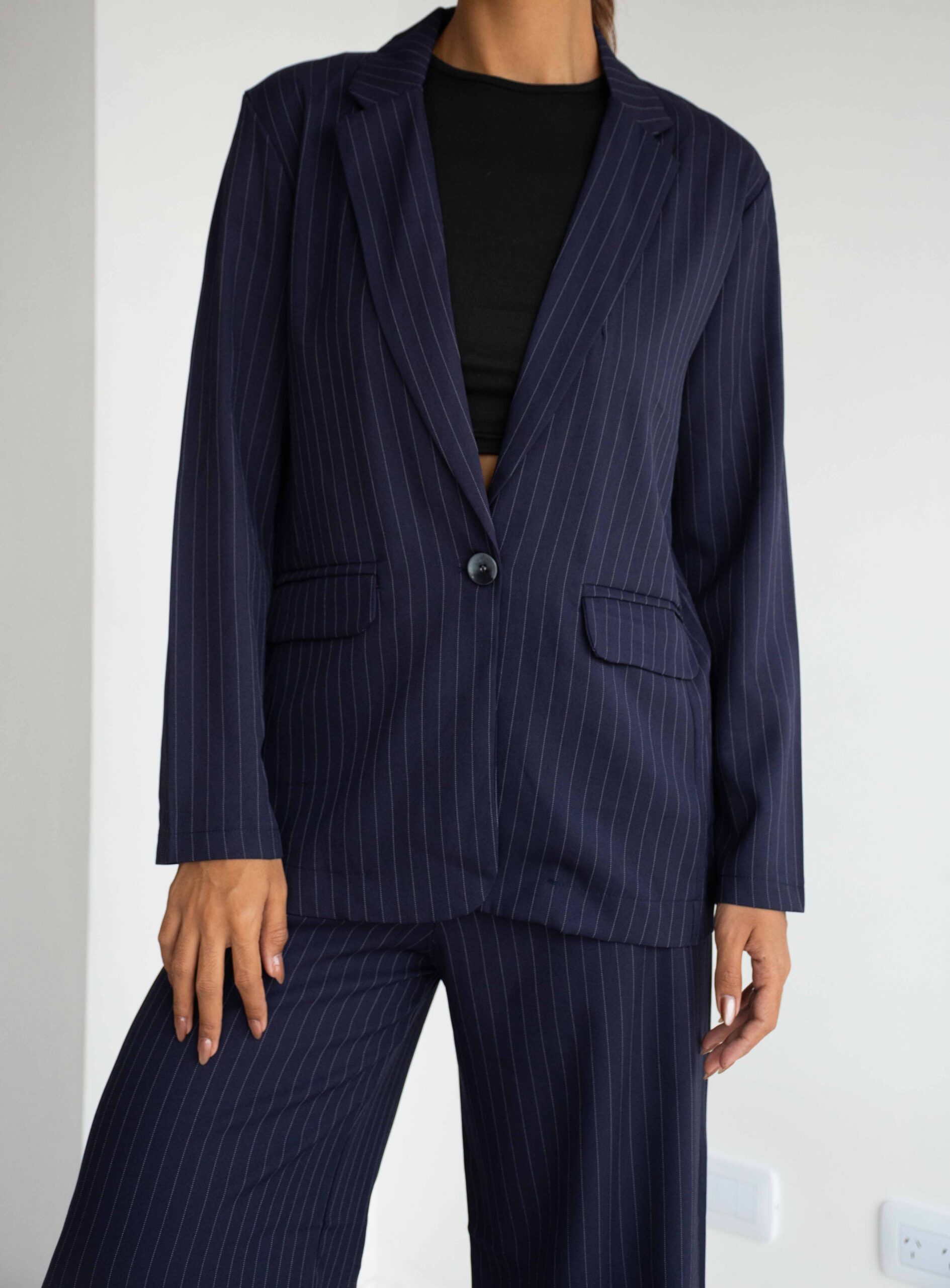 BLAZER SASTRERO TELA CON RAYAS NEGRAS, ES DE CORTE MEDIO PASANDO LA CINTURA, CUENTA CON LOS BOLSILLOS CHINOS EN ADELANTE, VIENEN CON EL BOTÓN A TONO DEL BLAZER Y CON UN TAJO A LA PARTE DE ATRÁS.
