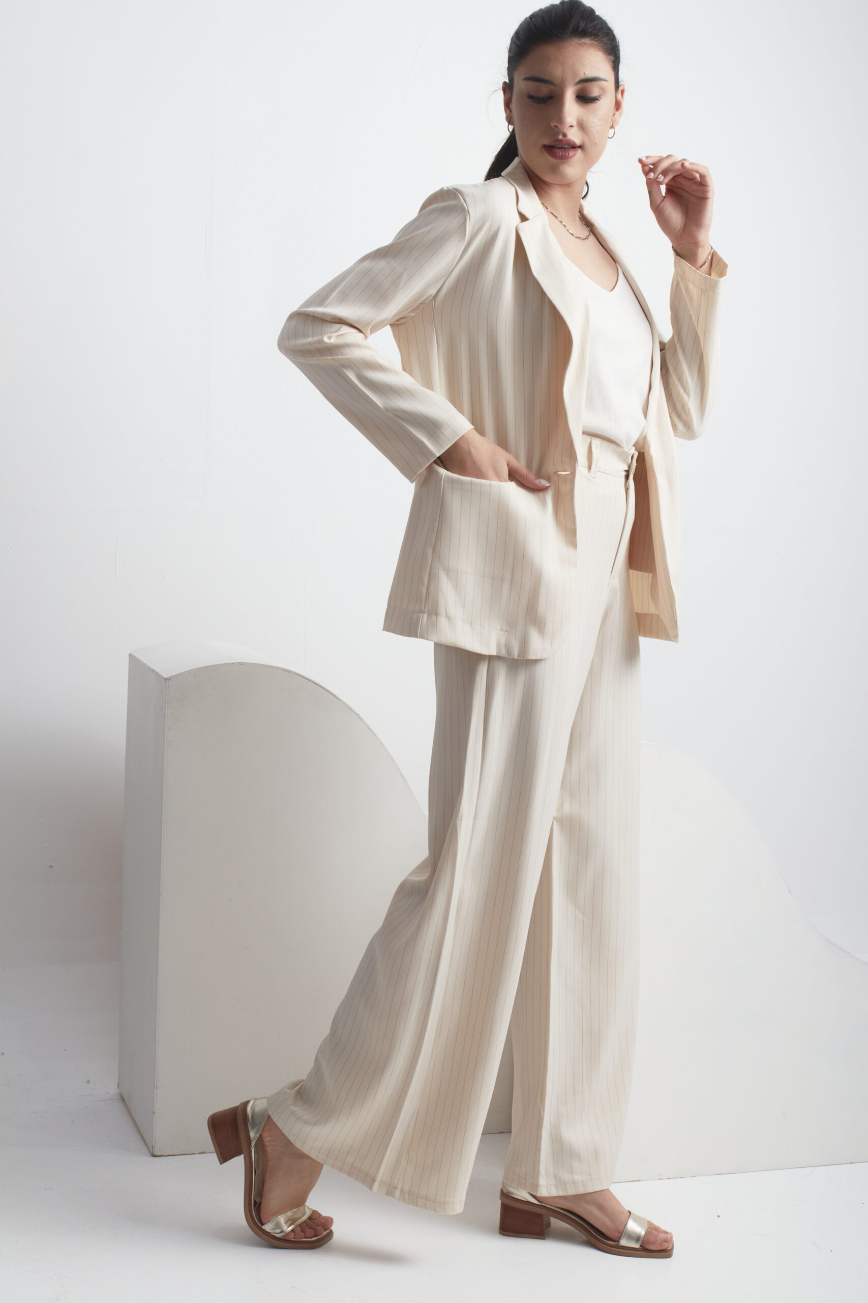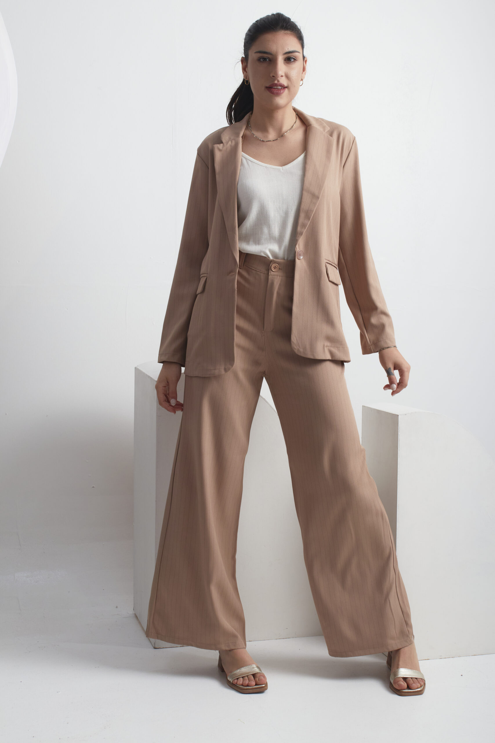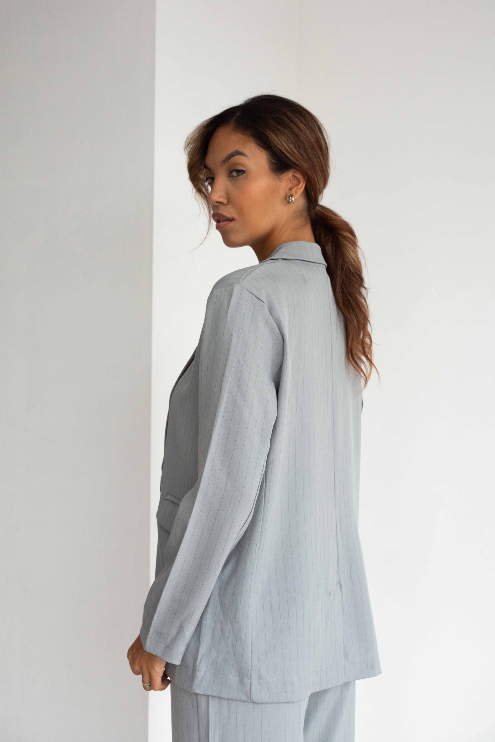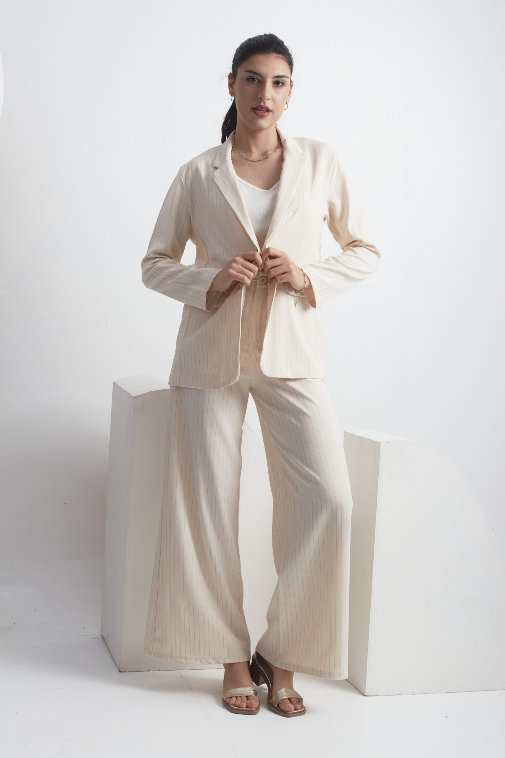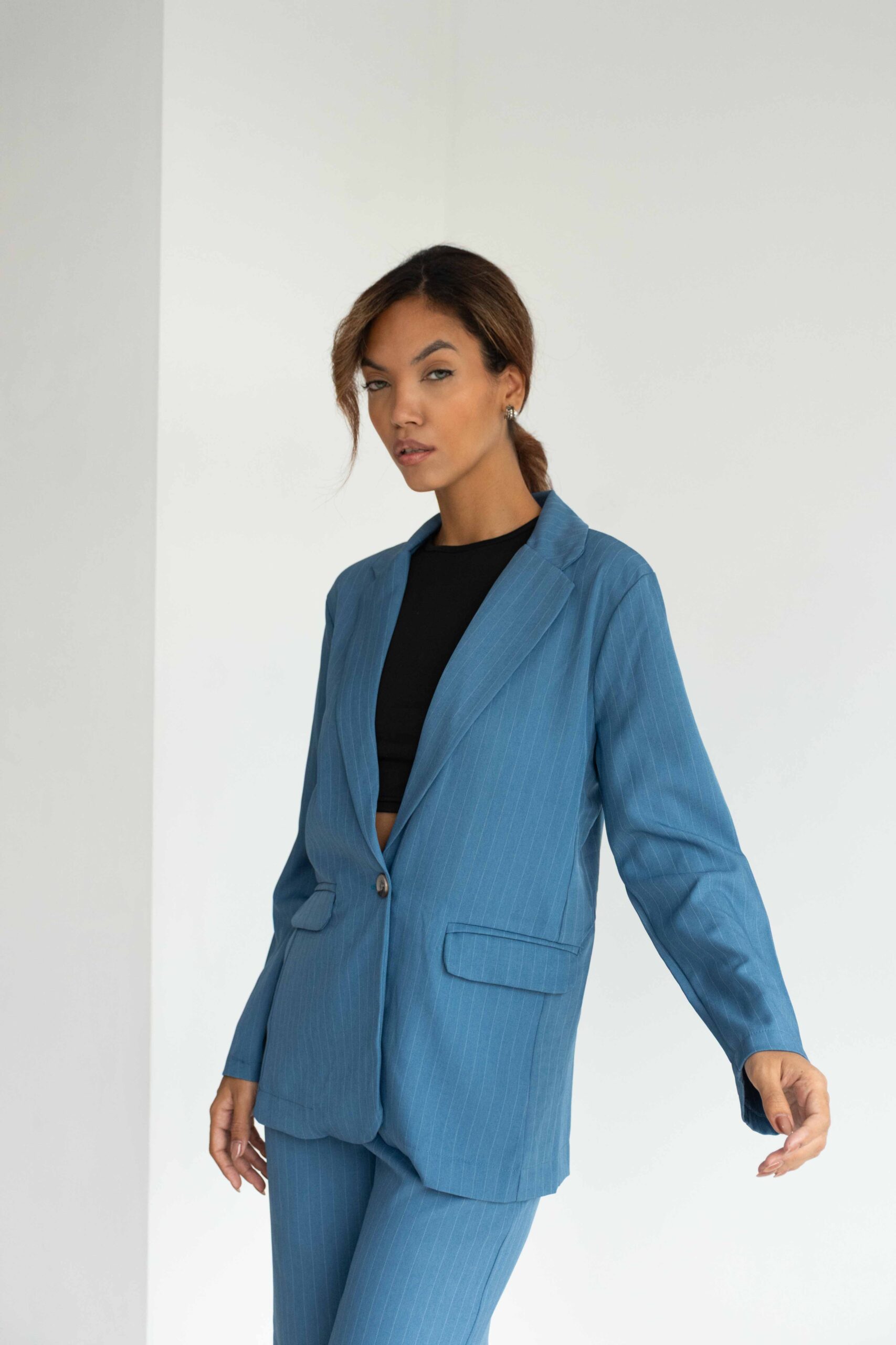 BLAZER SASTRERO TELA CON RAYAS NEGRAS, ES DE CORTE MEDIO PASANDO LA CINTURA, CUENTA CON LOS BOLSILLOS CHINOS EN ADELANTE, VIENEN CON EL BOTÓN A TONO DEL BLAZER Y CON UN TAJO A LA PARTE DE ATRÁS.