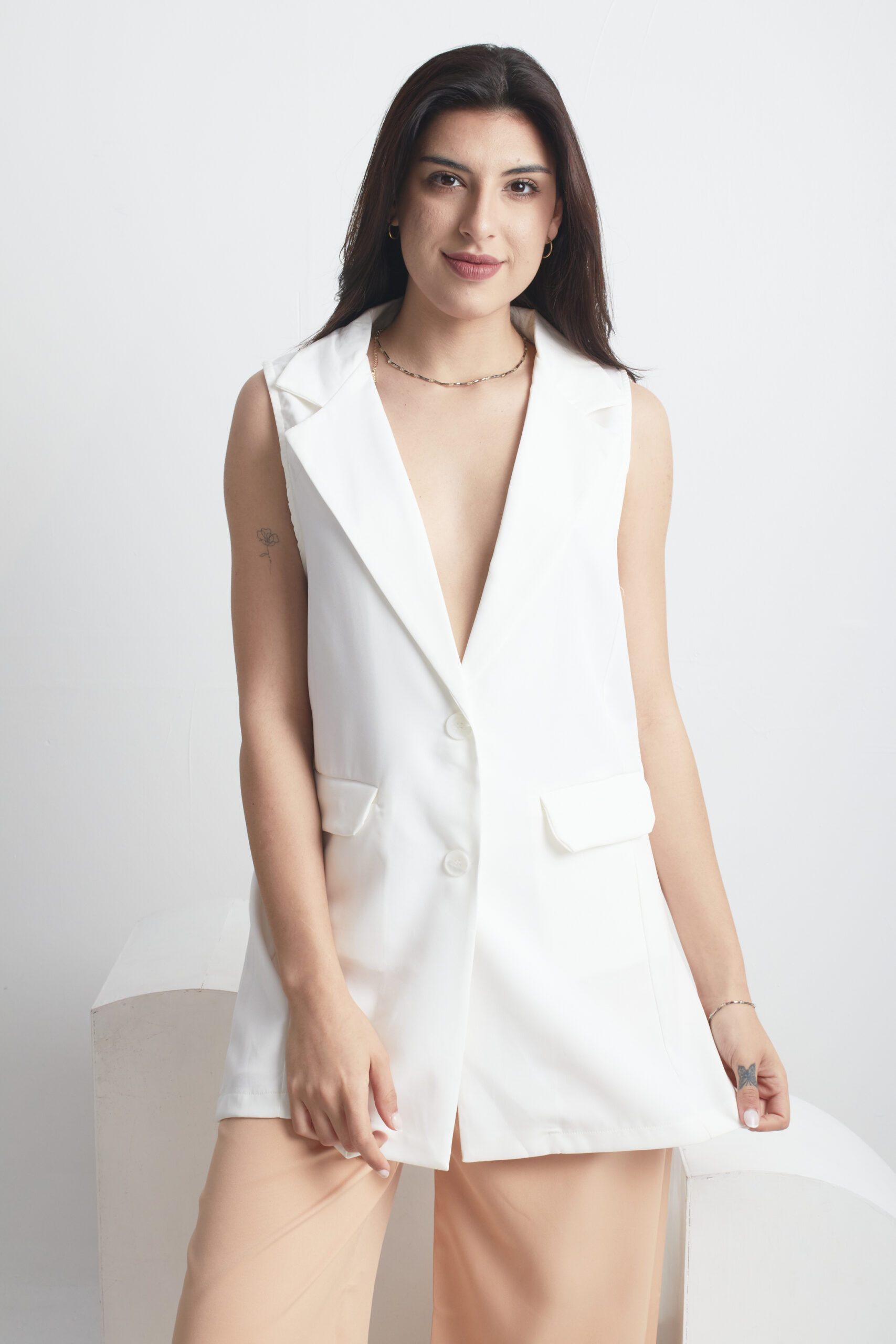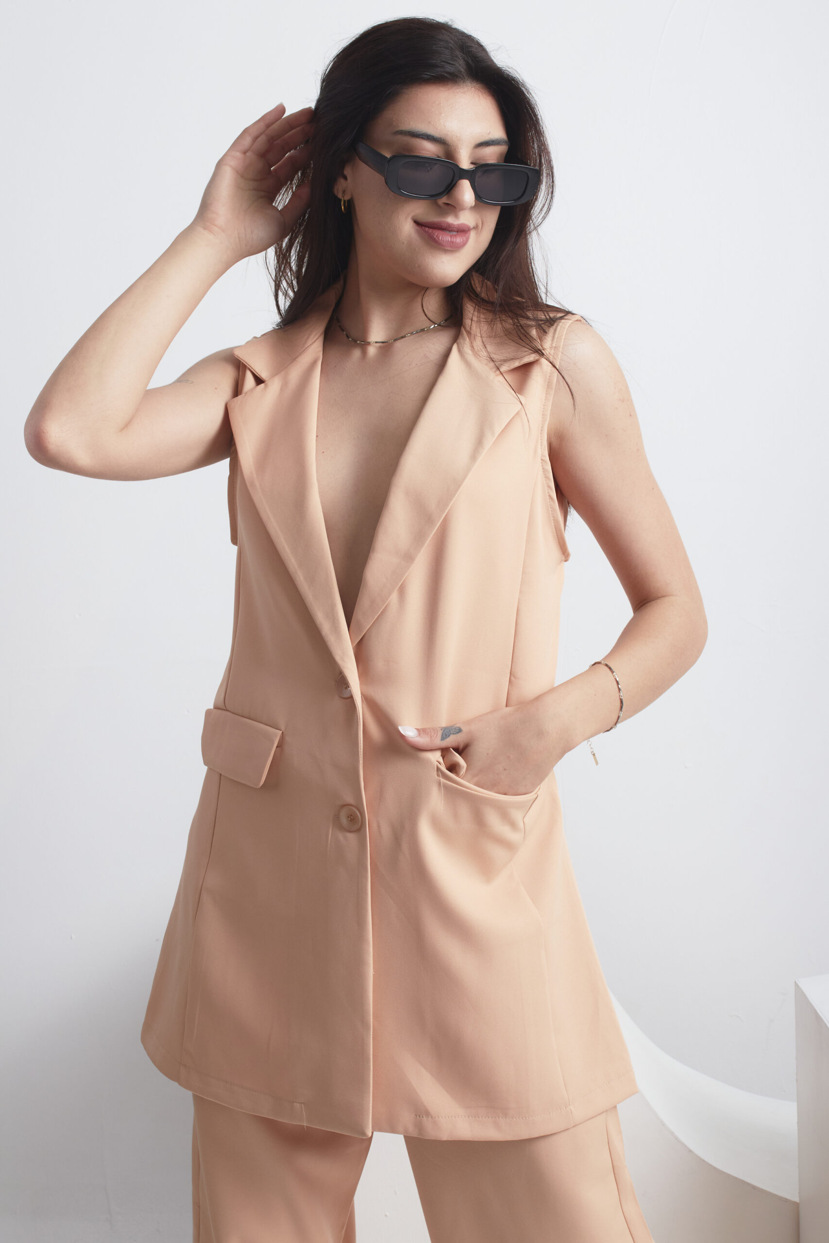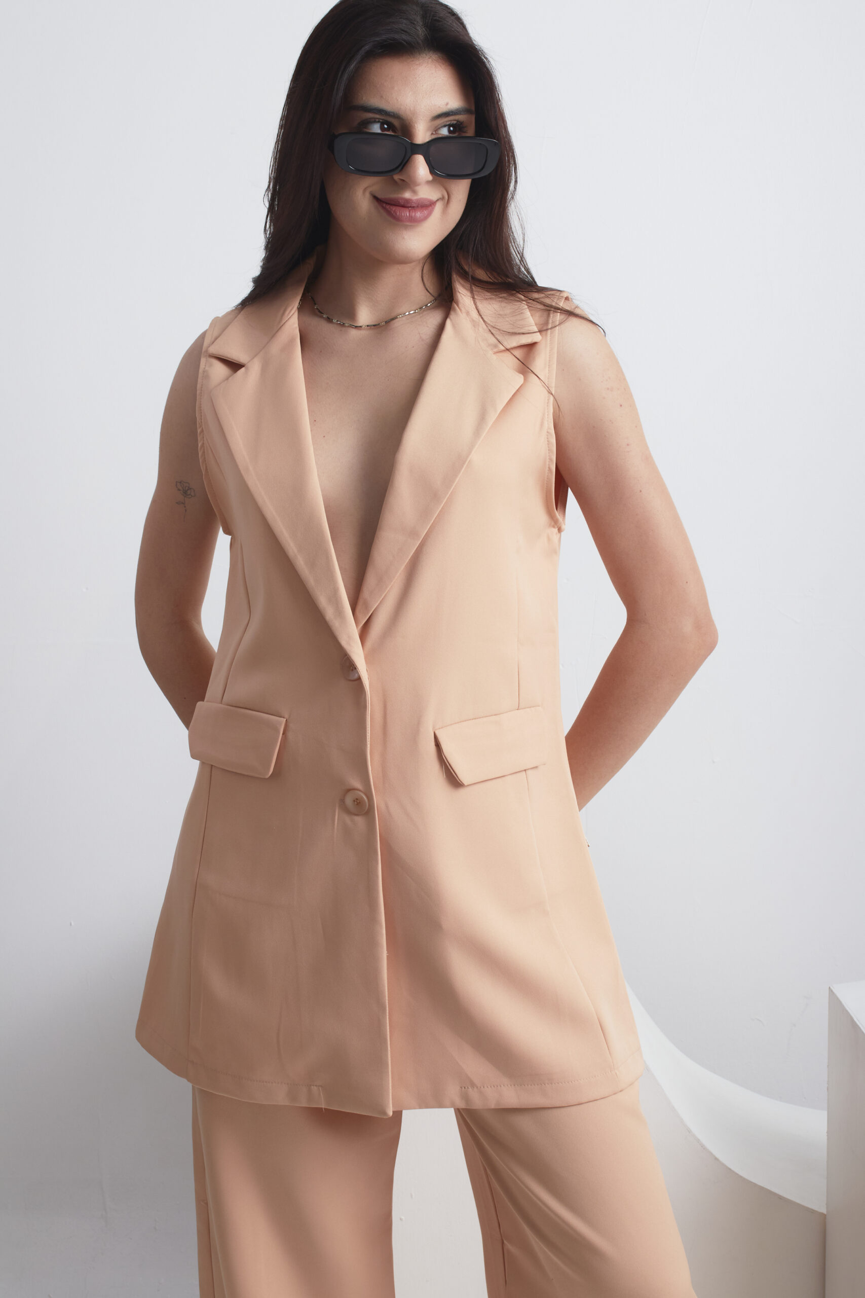 CHALECO SASTRERO LARGO, CON BOTONES AL TONO DEL BLAZER, Y BOLSILLO CHINO.