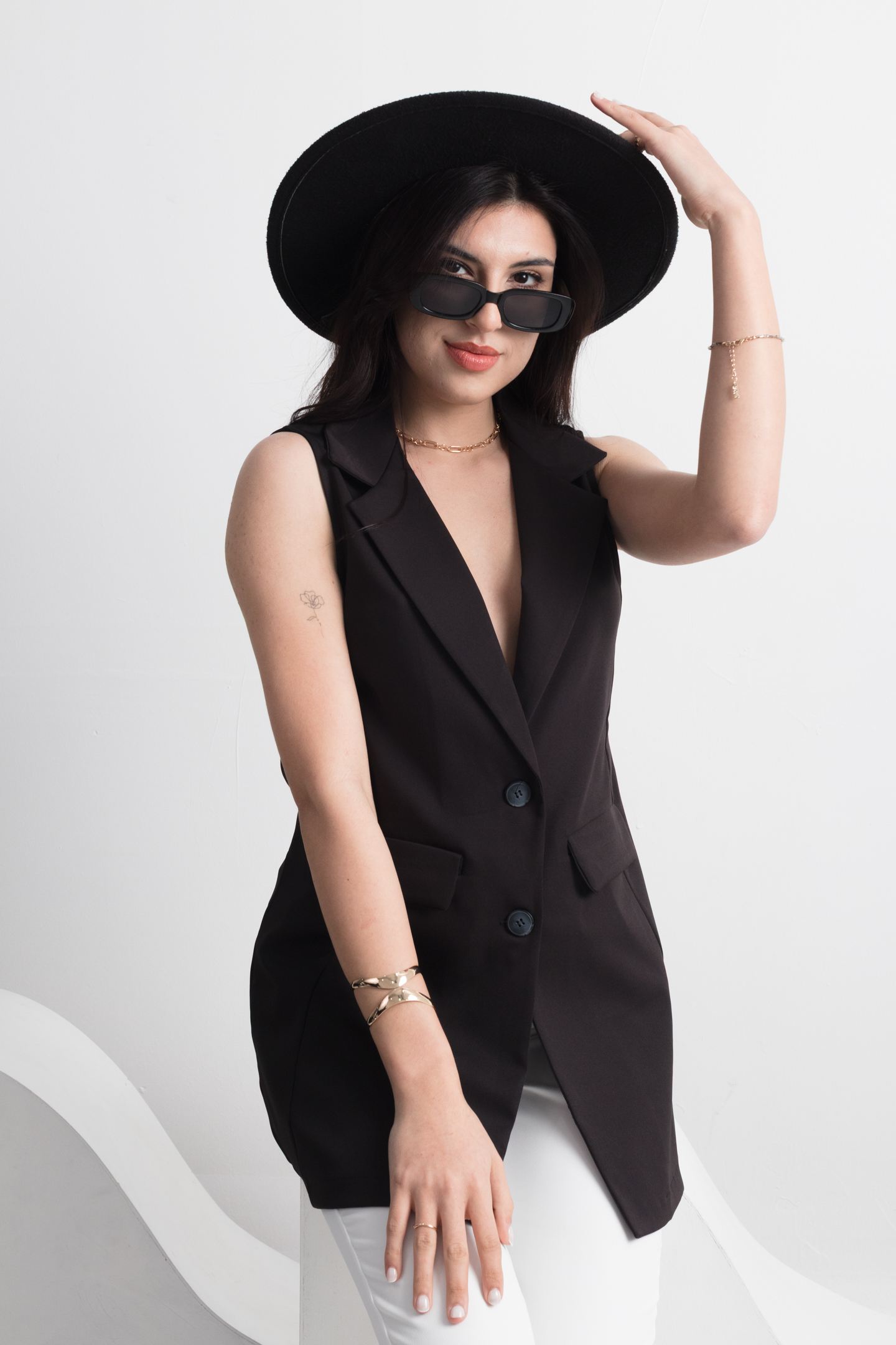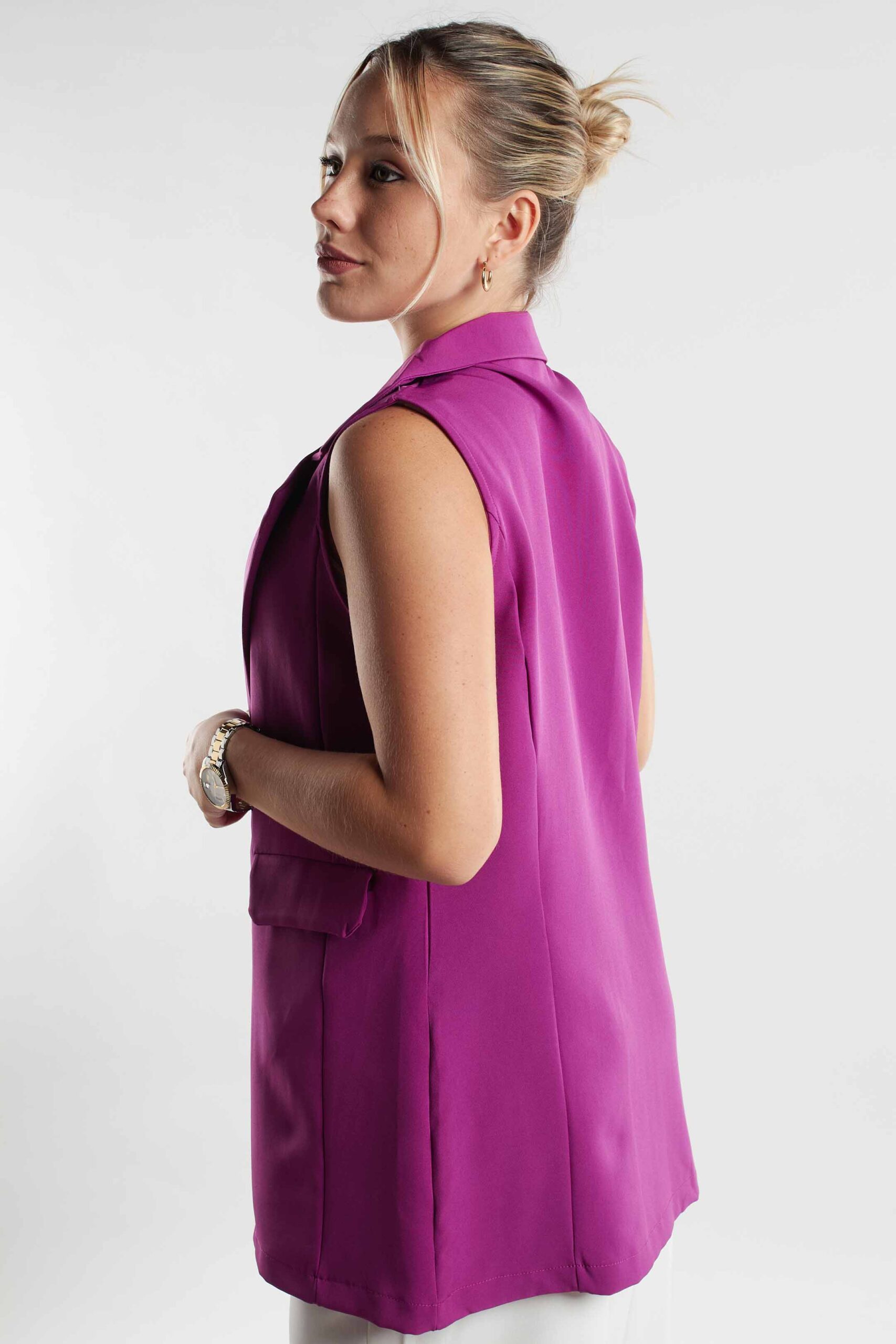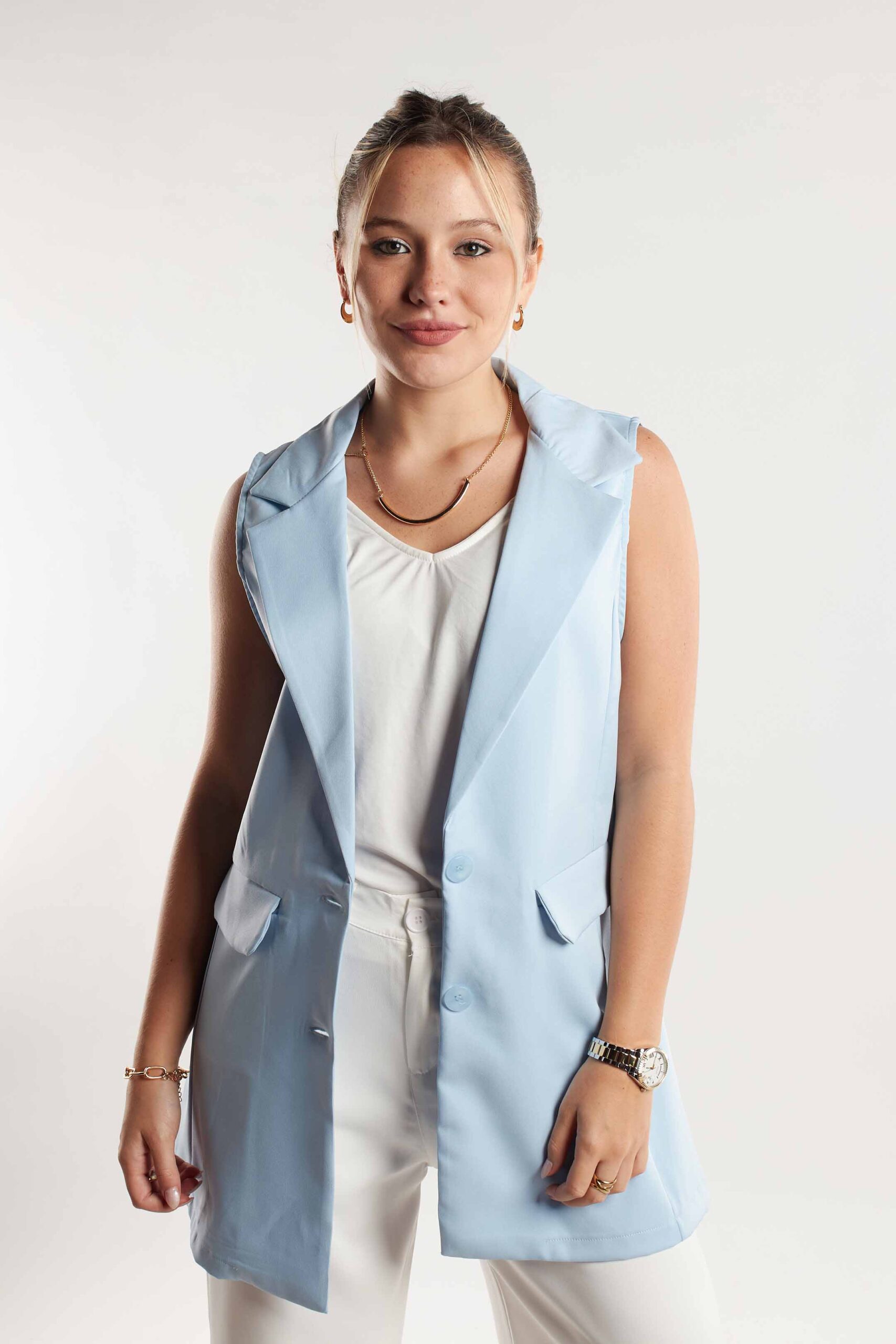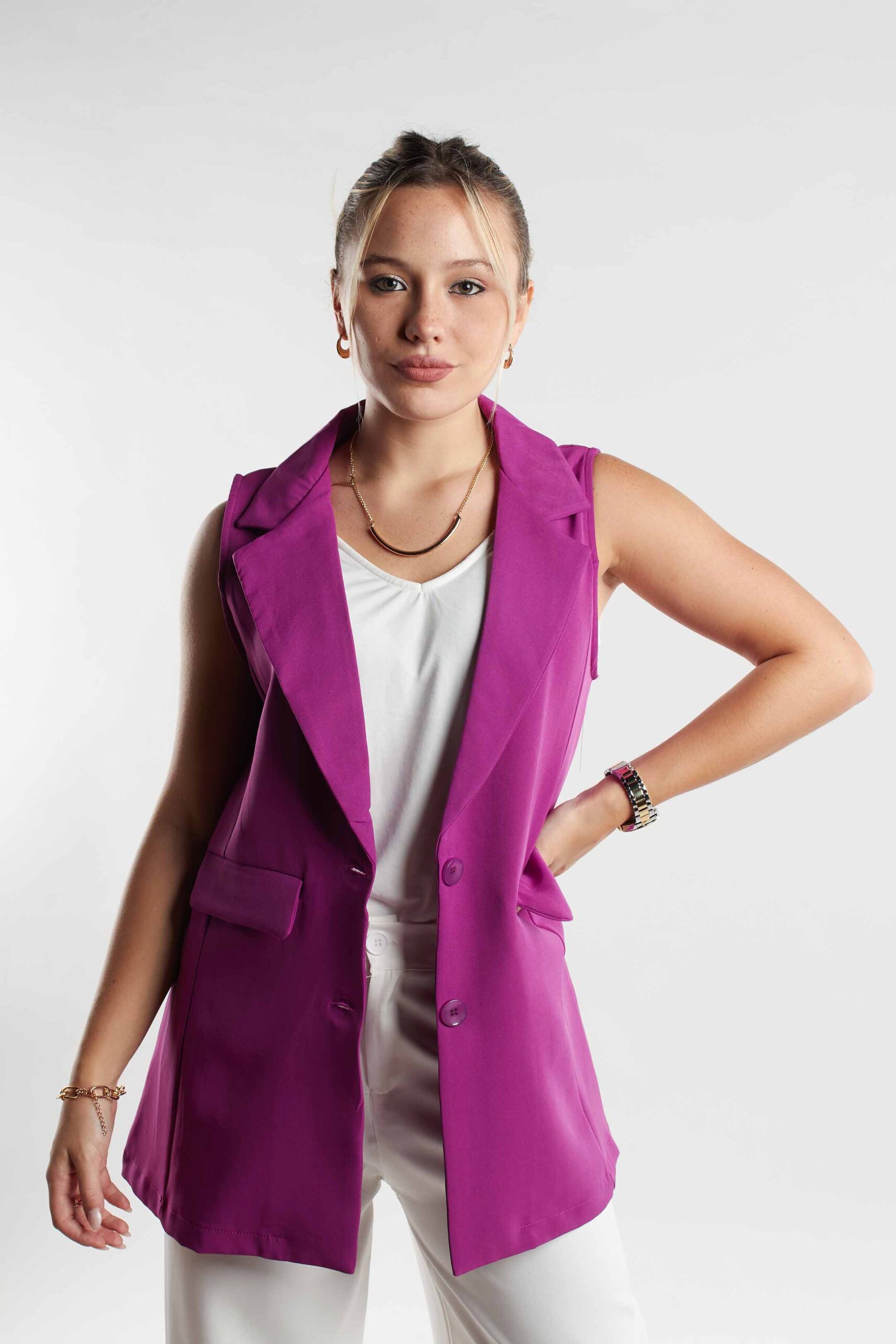 CHALECO SASTRERO LARGO, CON BOTONES AL TONO DEL BLAZER, Y BOLSILLO CHINO.
